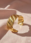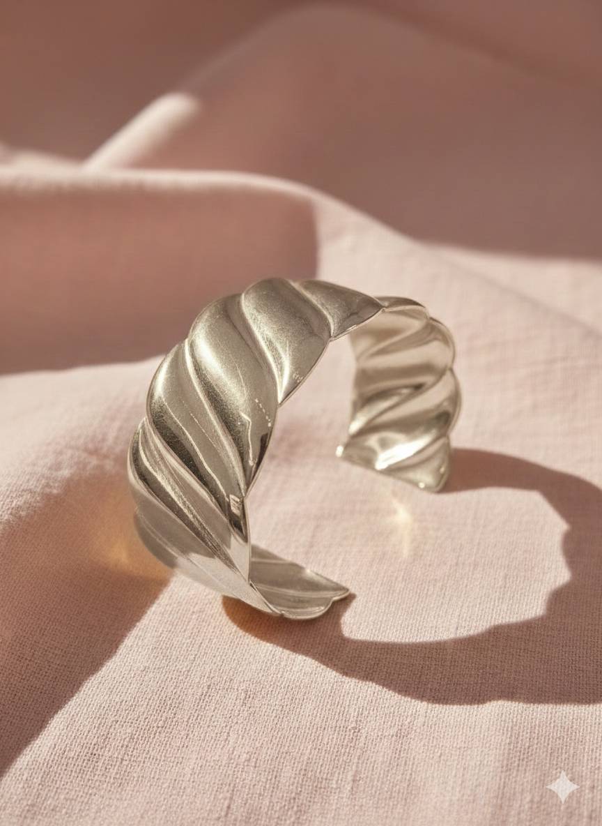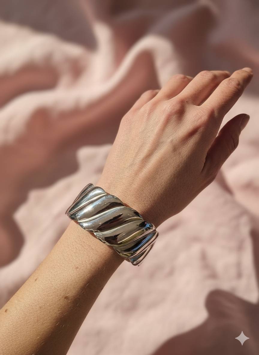 Ha una lavorazione ondulata che cattura la luce in modo bellissimo e dà subito movimento al polso. È elegante, femminile, ma con carattere: non il solito bracciale liscio, insomma. Basta lui per dare personalità anche all’outfit più semplice, disponibile sia oro che argento