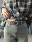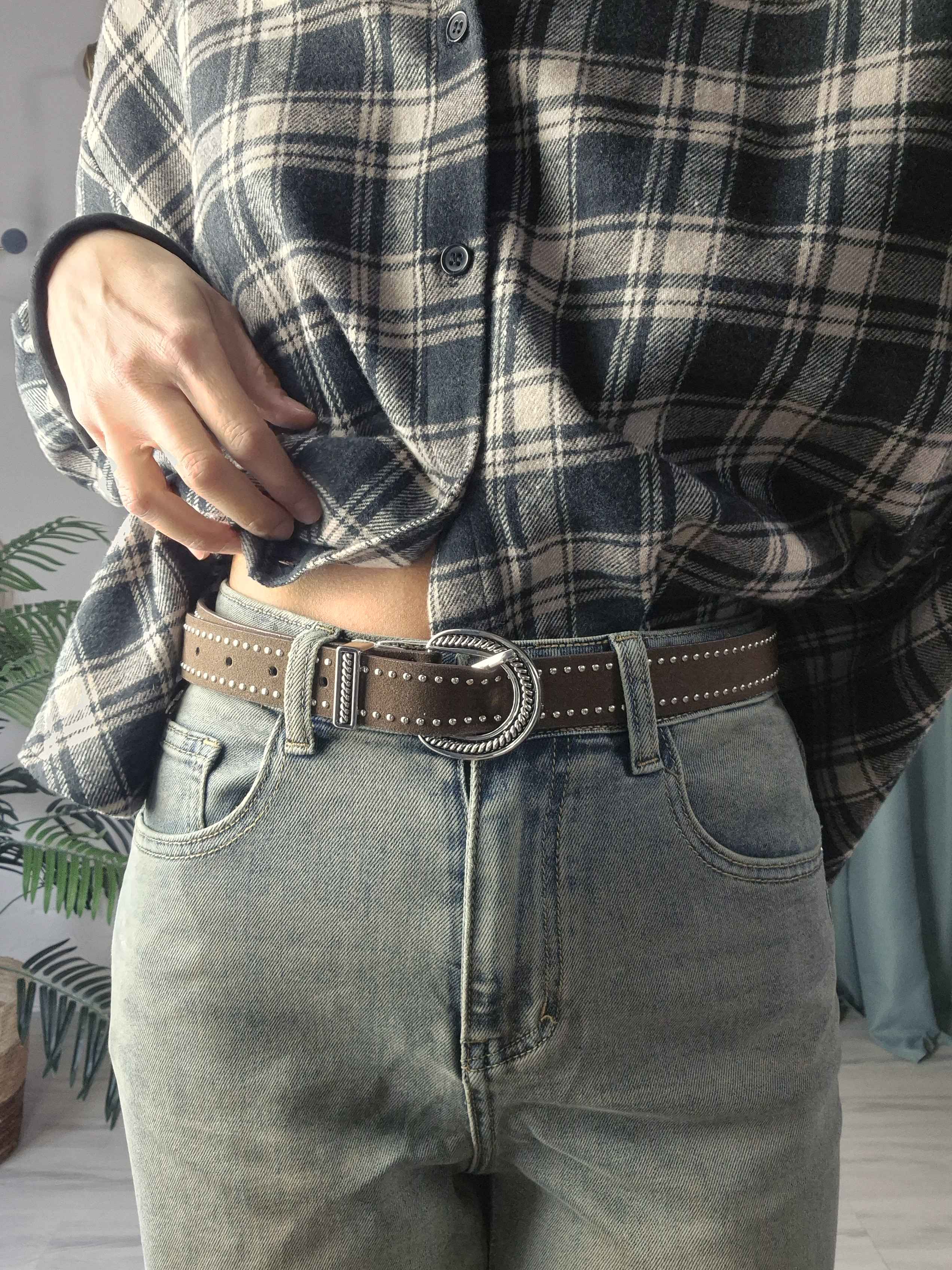 Una cintura che non passa inosservata: l’effetto suede si unisce alle micro borchie argento che la percorrono interamente, valorizzata da una fibbia ovale lavorata che richiama lo stile western. È l’accessorio perfetto per dare personalità a un look semplice o per completare un outfit dal carattere deciso.