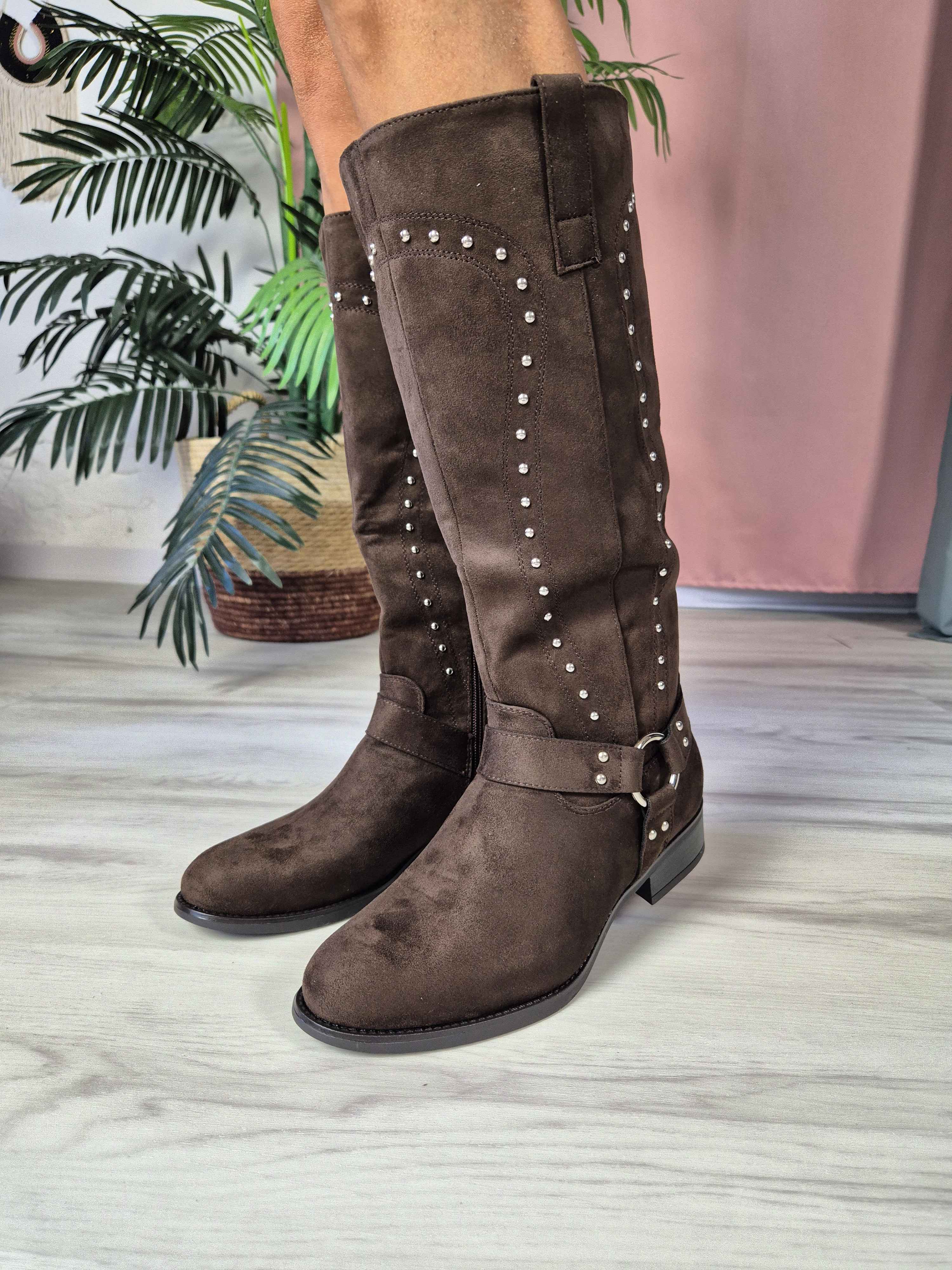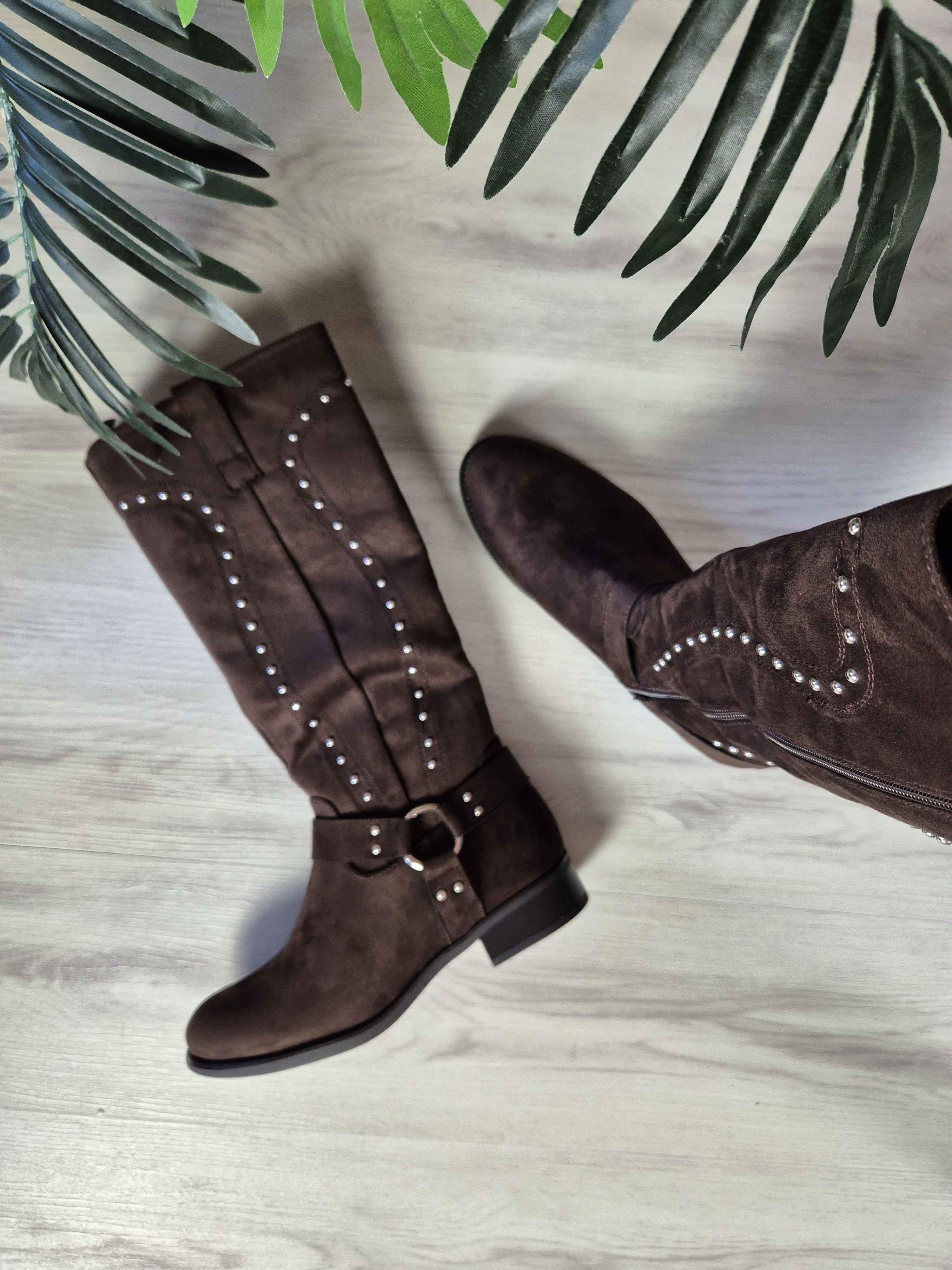 Lo stivale Denver è pensato per chi ama distinguersi con dettagli unici. In marrone scuro effetto suede, impreziosito da micro-borchie e cinturino con anello, porta con sé l’anima texana rivisitata in chiave contemporanea. Il gambale di 30 cm e il tacco comodo da 3 cm lo rendono pratico e versatile, mentre l’interno leggero è perfetto anche per la mezza stagione.