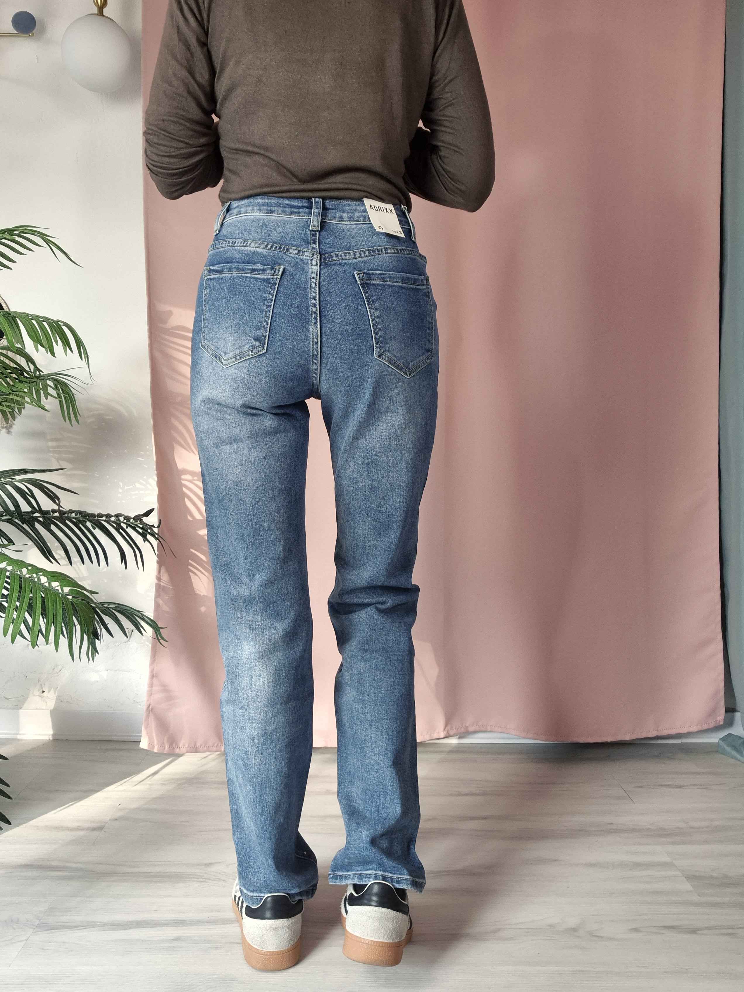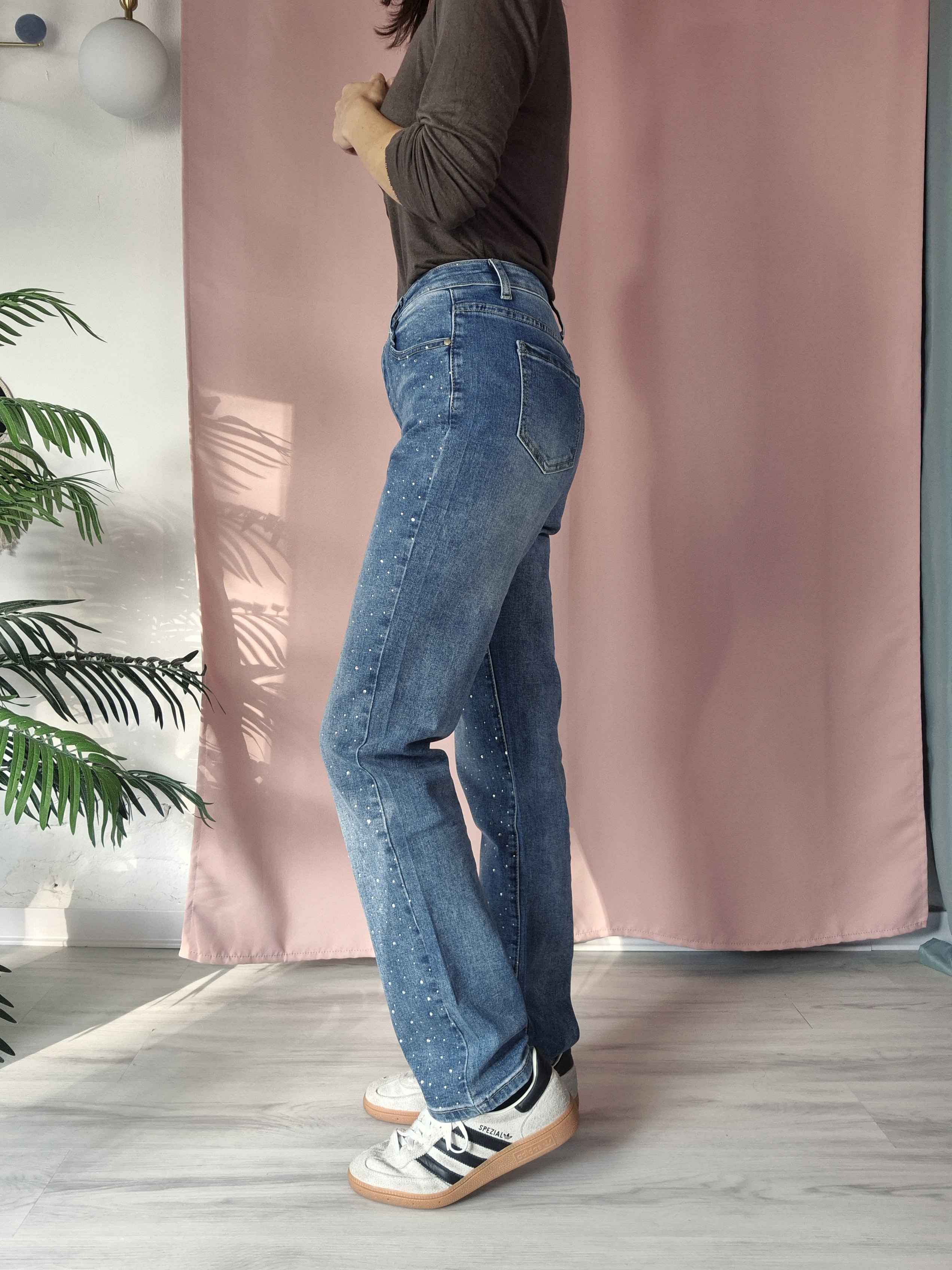 Dettagli: micro borchie applicate sul davanti, retro liscio, vita regolare, modello cinque tasche