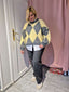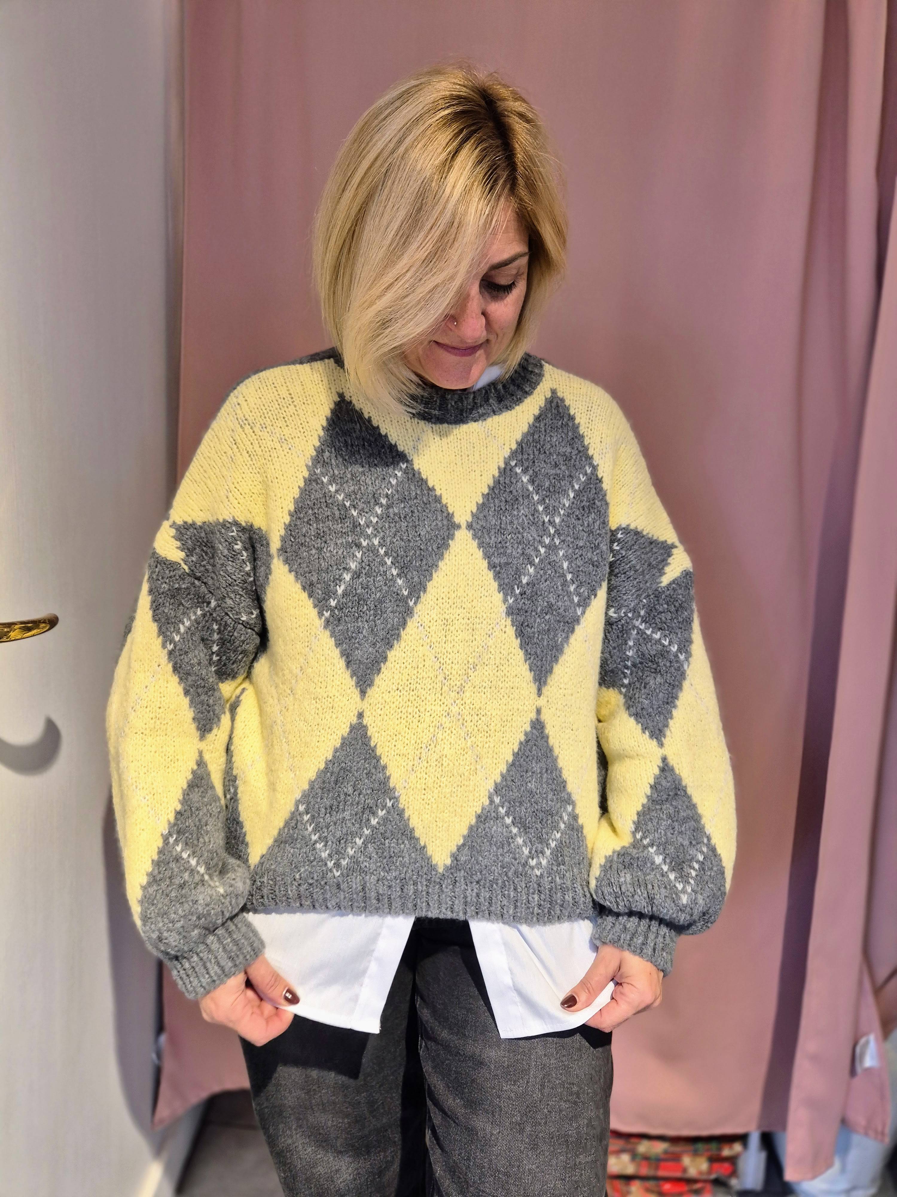 Il motivo a rombi sul davanti regala un’allure vintage e ricercata, mentre la parte posteriore tinta unita mantiene un equilibrio elegante e moderno.