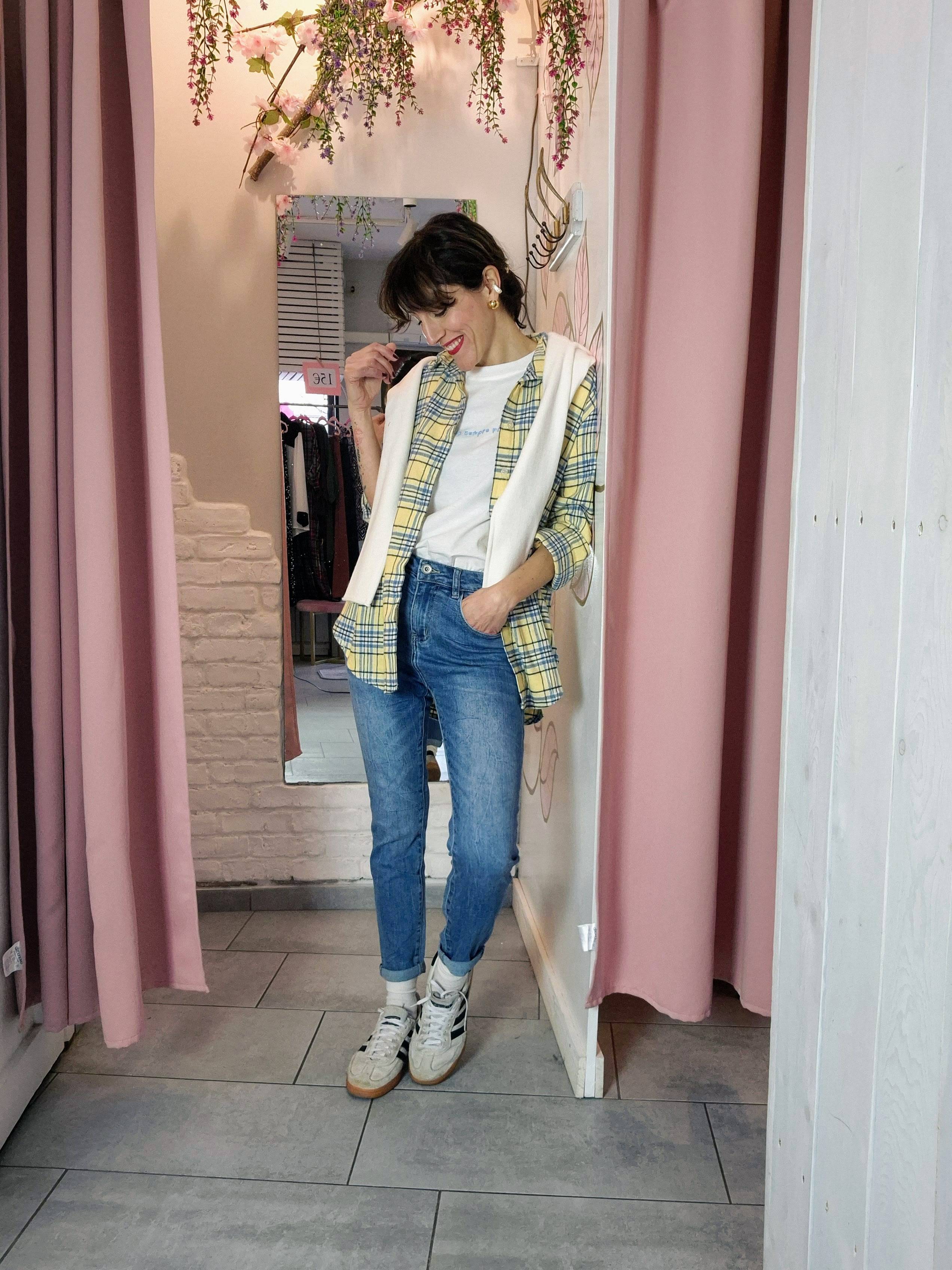 Il tessuto è elasticizzato e confortevole, segue le forme senza costringere e garantisce una vestibilità piacevole per tutta la giornata.