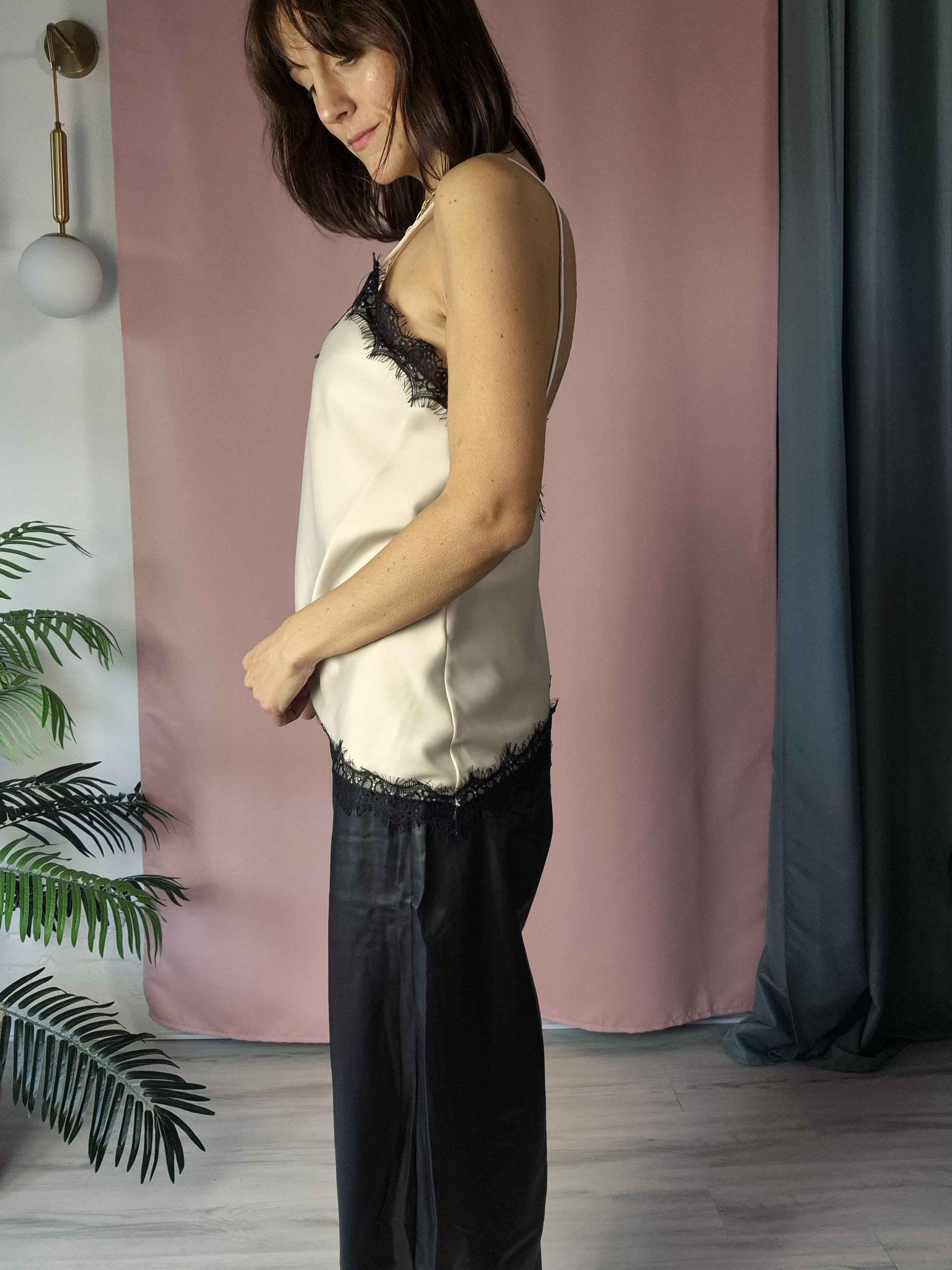 La versione più versatile e raffinata del vestito Satin Elodie: la Canotta Satin Elodie riprende lo stesso tessuto lucente e la delicata finitura in pizzo, in una versione più corta e facilmente abbinabile.