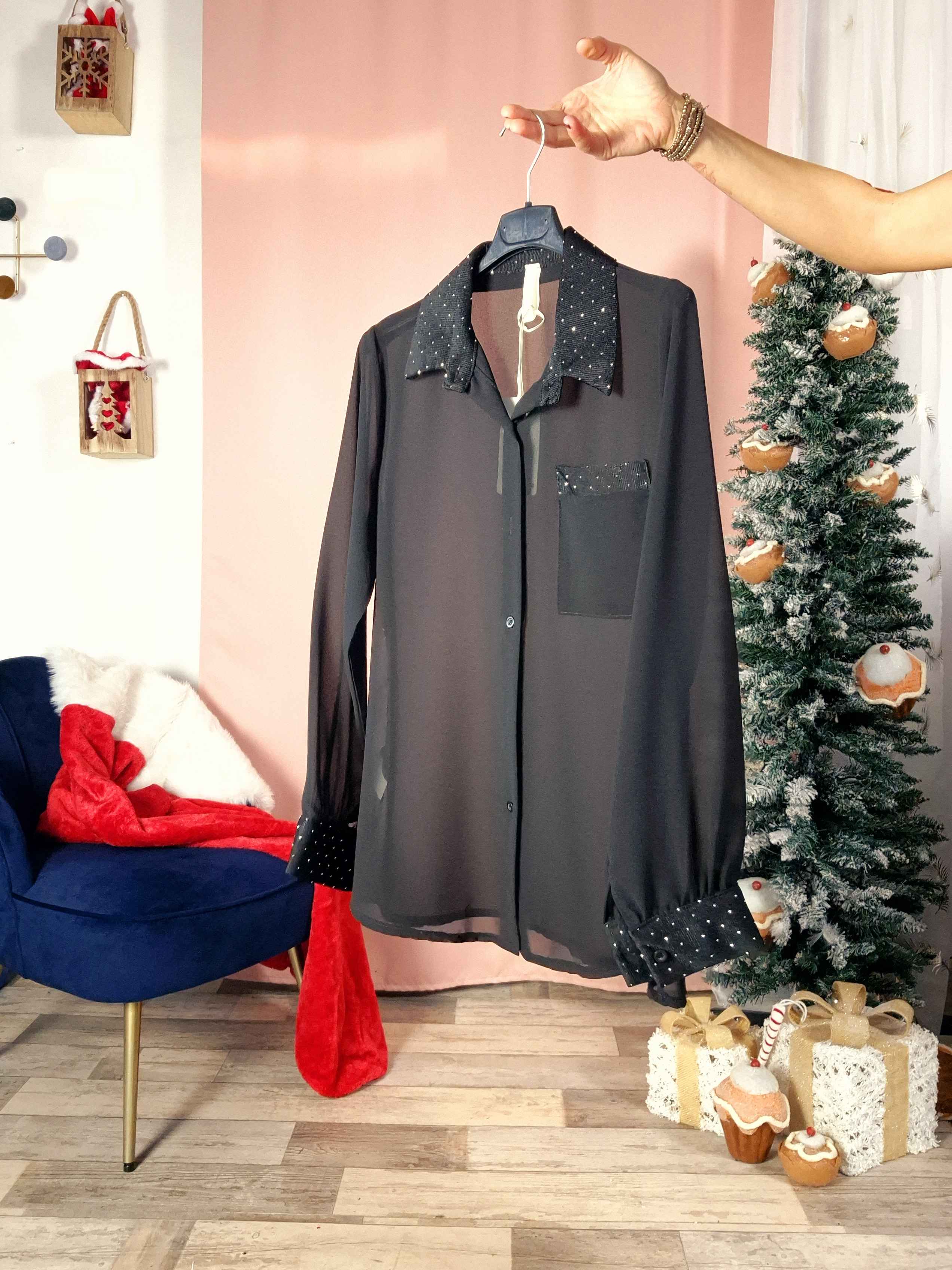 Una camicia elegante, femminile e luminosa: la Camicia Gianna è il capo perfetto per dare un tocco chic anche agli outfit più semplici. Realizzata in tessuto leggero e semi-trasparente, scivola delicatamente sulla pelle creando un effetto raffinato e moderno. Il dettaglio che la rende unica è l’applicazione di micro borchiette luminose sul colletto e sui polsini, che aggiungono un punto luce elegante senza risultare eccessivo.