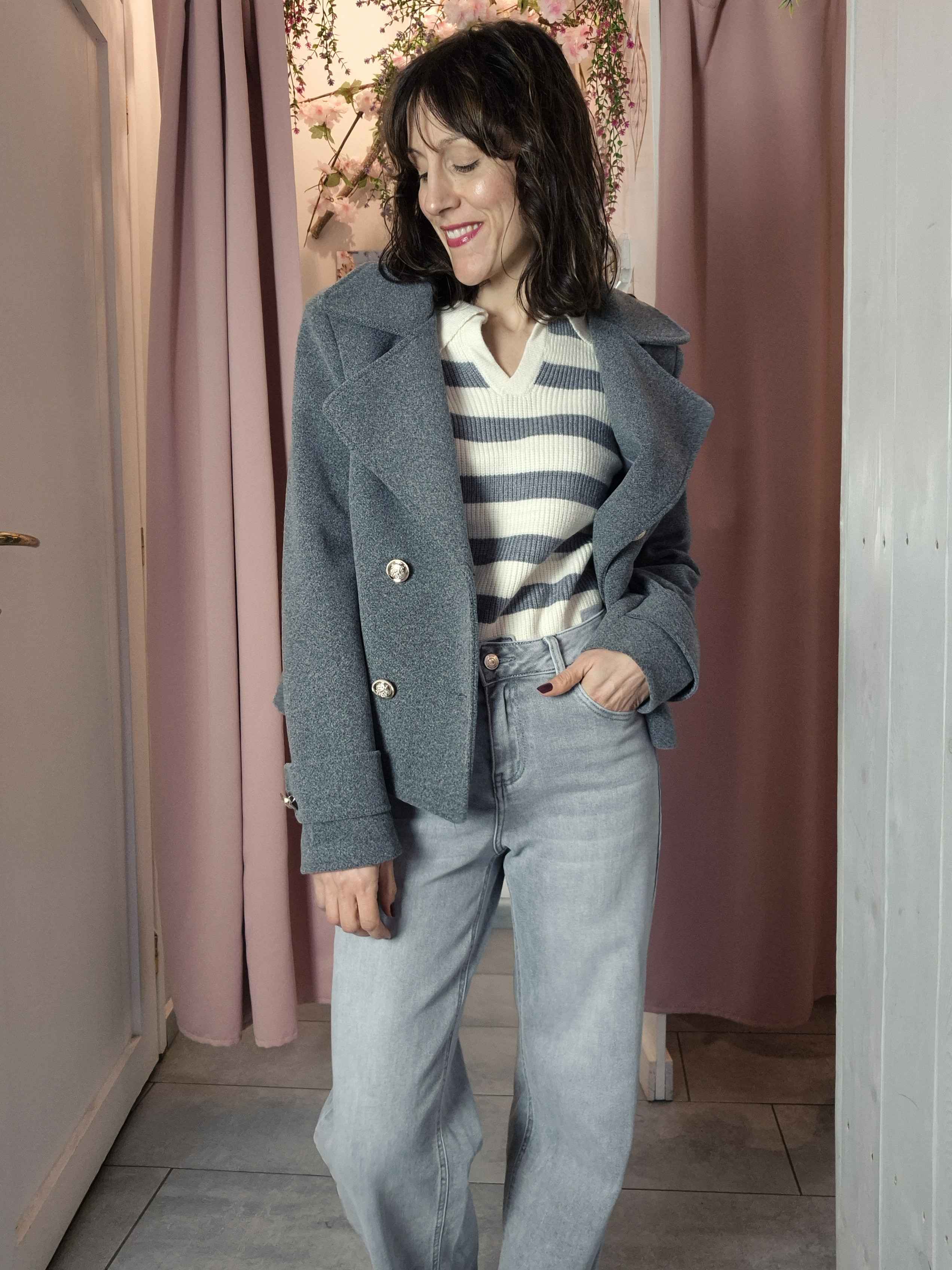 Realizzato in panno morbido e avvolgente, presenta una linea leggermente svasata che valorizza la figura e accompagna i movimenti con naturalezza.