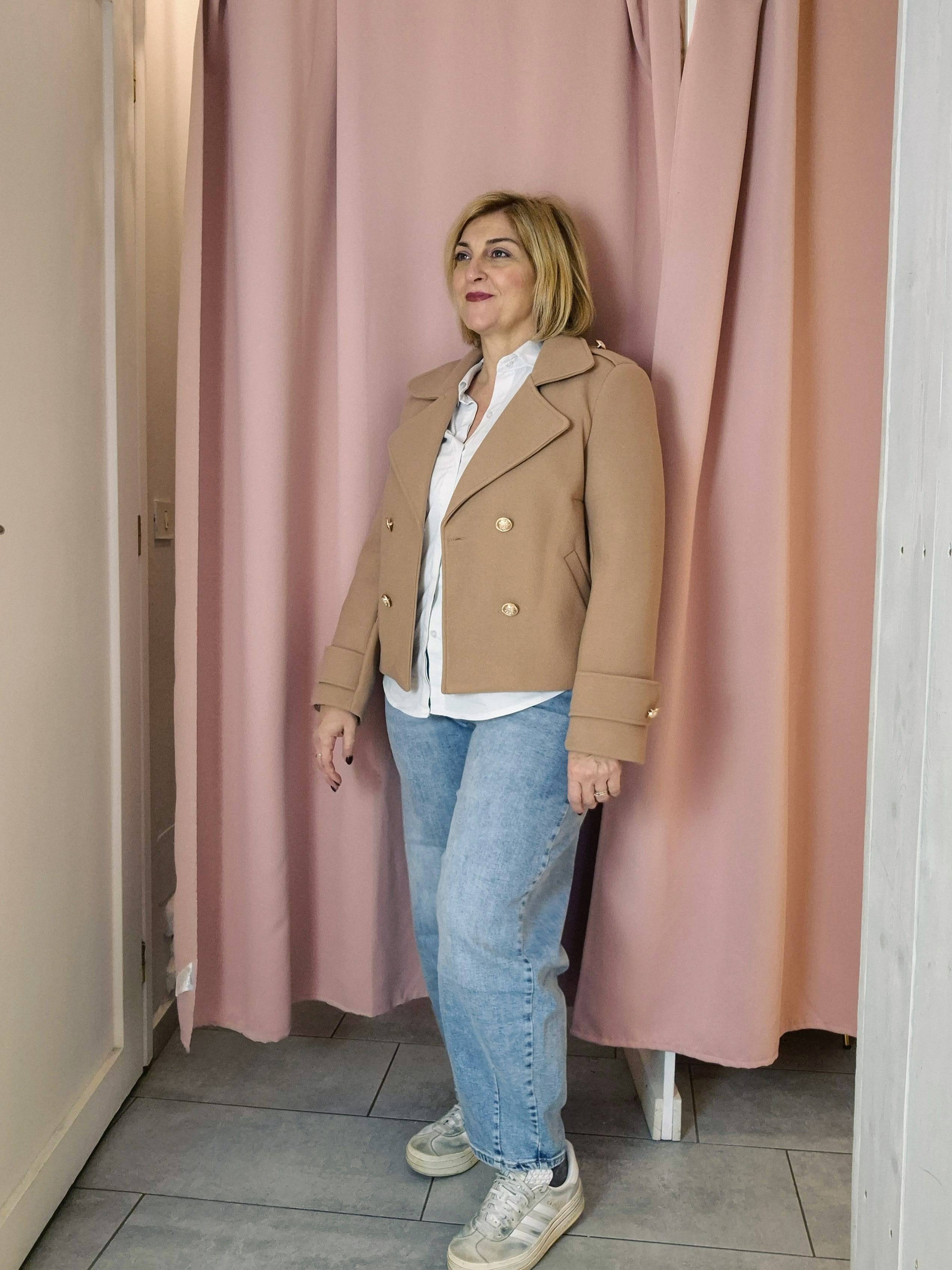 Il doppiopetto è impreziosito da bottoni oro lavorati, veri protagonisti del capo, che donano luce e rendono il cappotto elegante e distintivo. È il classico capospalla che completa qualsiasi outfit, dal più quotidiano al più curato, con estrema facilità.
