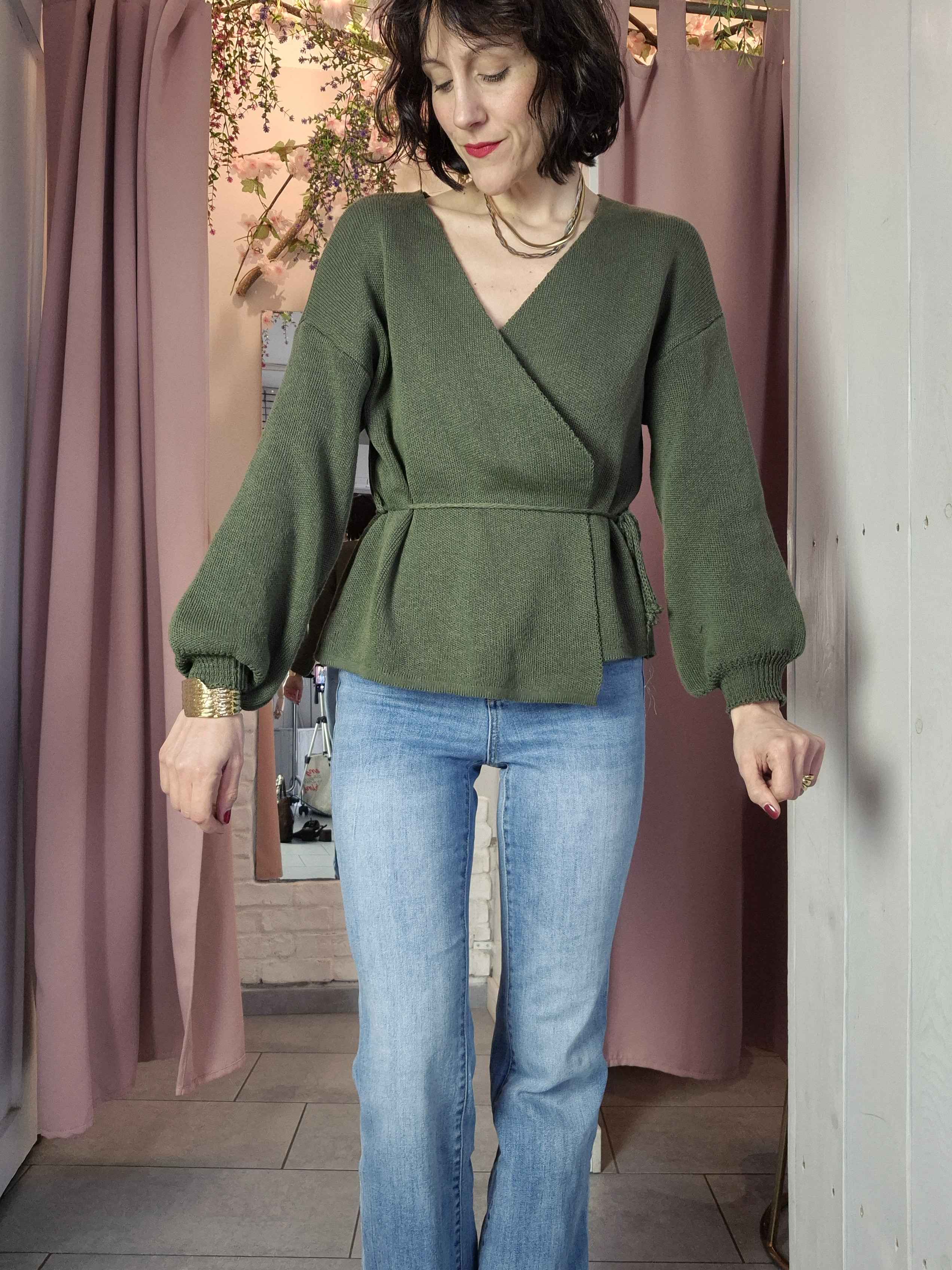 Le maniche a palloncino donano volume e movimento, mentre il taglio leggermente avvolgente rende questo cardigan perfetto sia indossato da solo come maglia, sia sopra un top o una camicia per un look più stratificato.