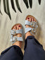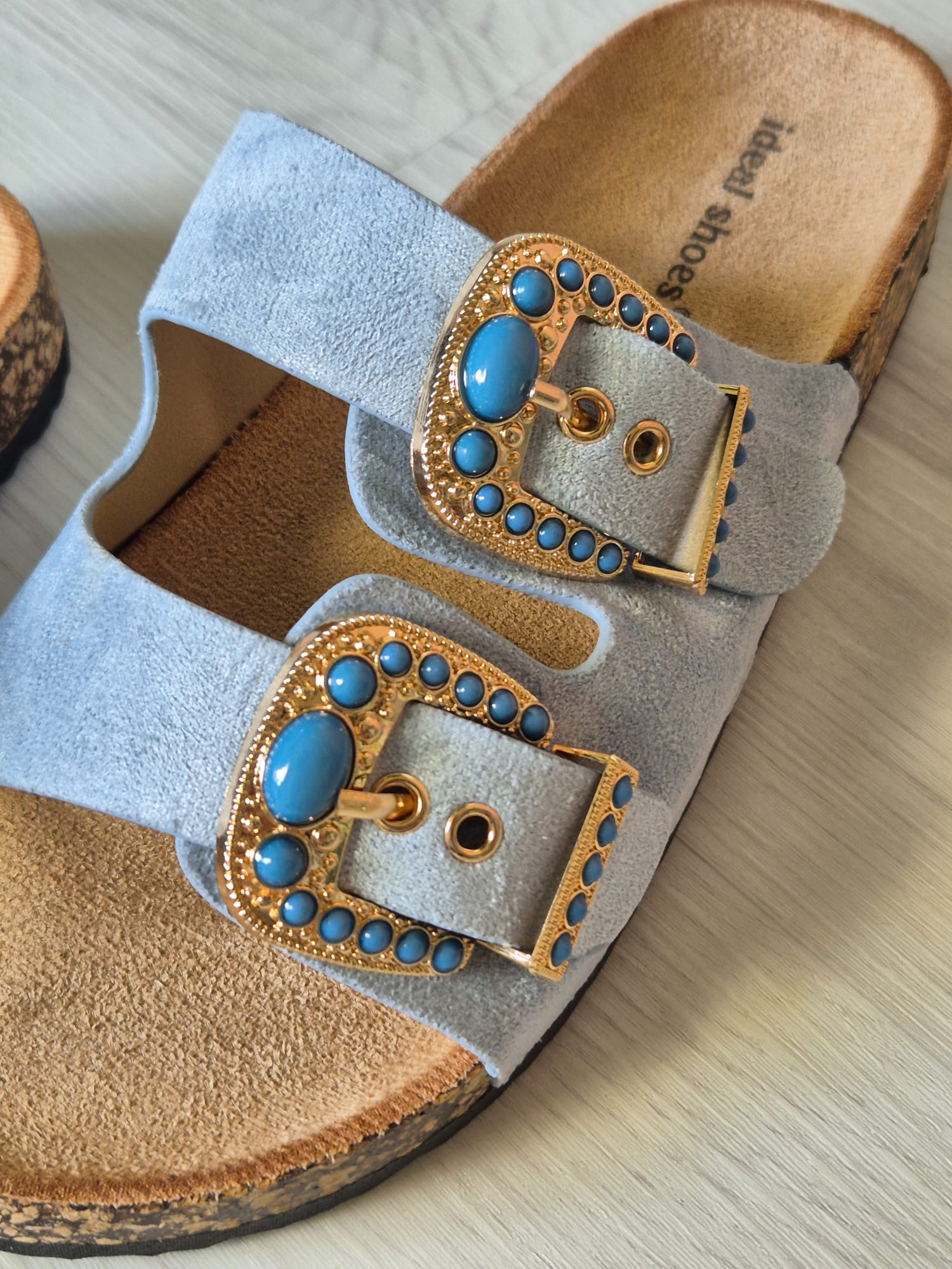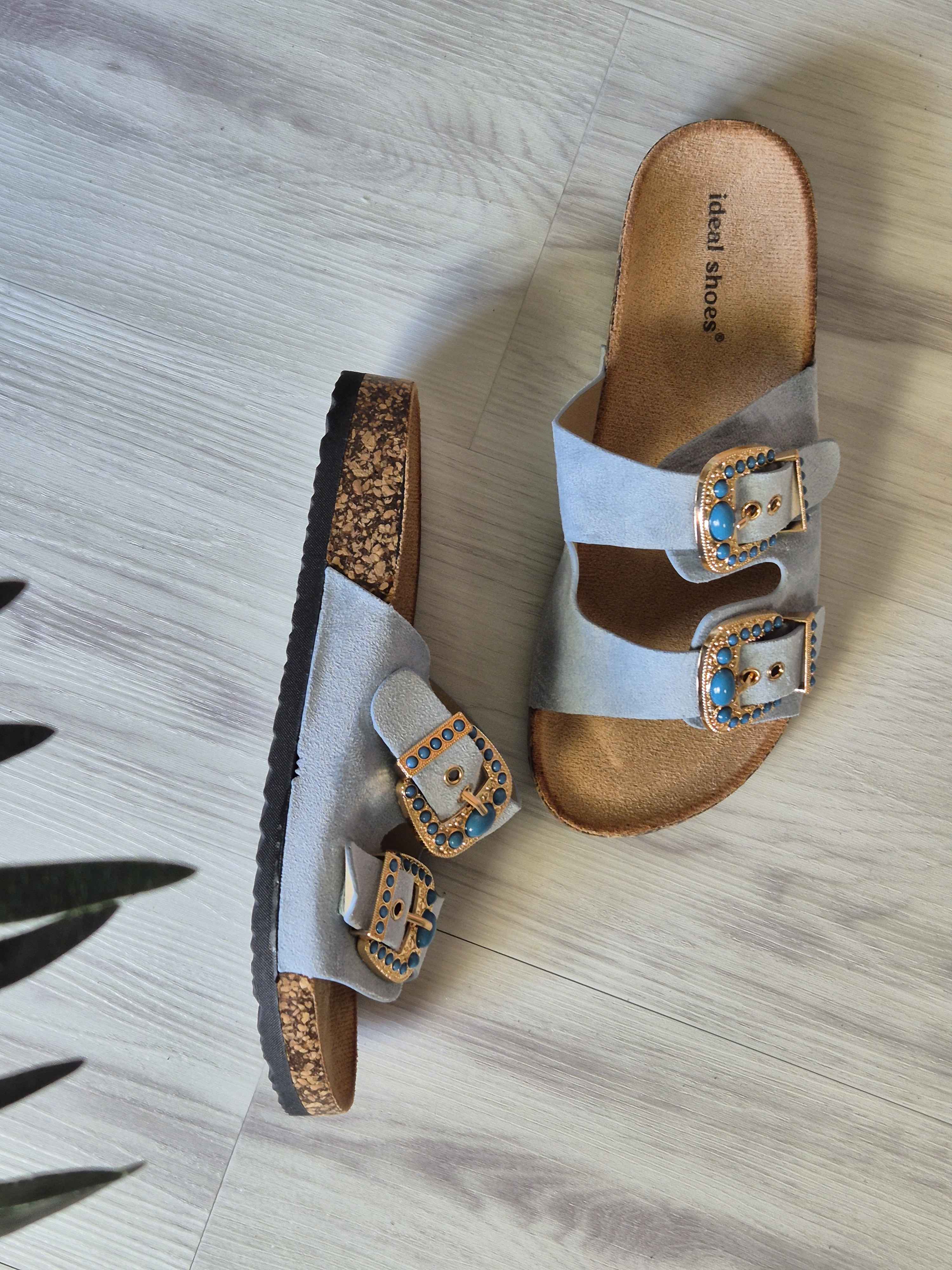 La Ciabatta Ibiza unisce comfort e stile con un dettaglio che non passa inosservato: le fibbie gioiello con pietre turchesi.