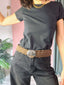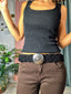 Una cintura che unisce carattere e artigianalità: l’effetto suede si intreccia in un motivo lavorato che regala texture e movimento, mentre la maxi fibbia rotonda in metallo inciso diventa il vero protagonista. Perfetta per dare un tocco boho-chic o western ai tuoi outfit, è l’accessorio che trasforma anche i look più semplici.