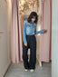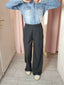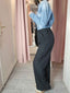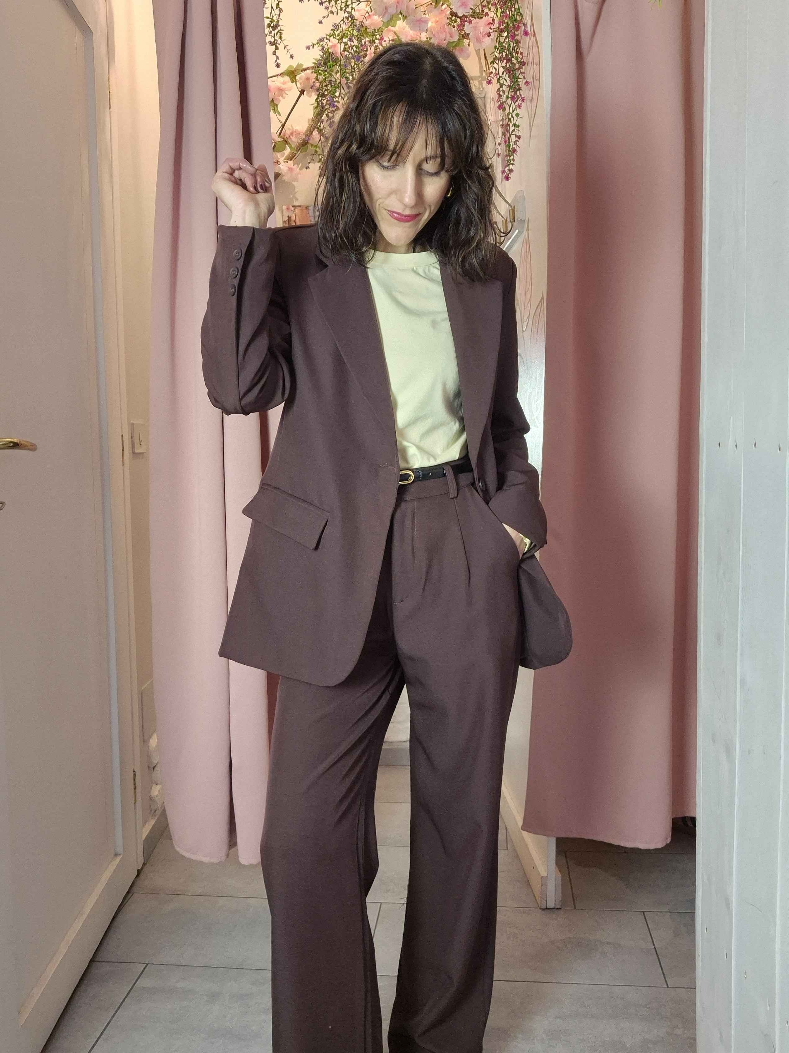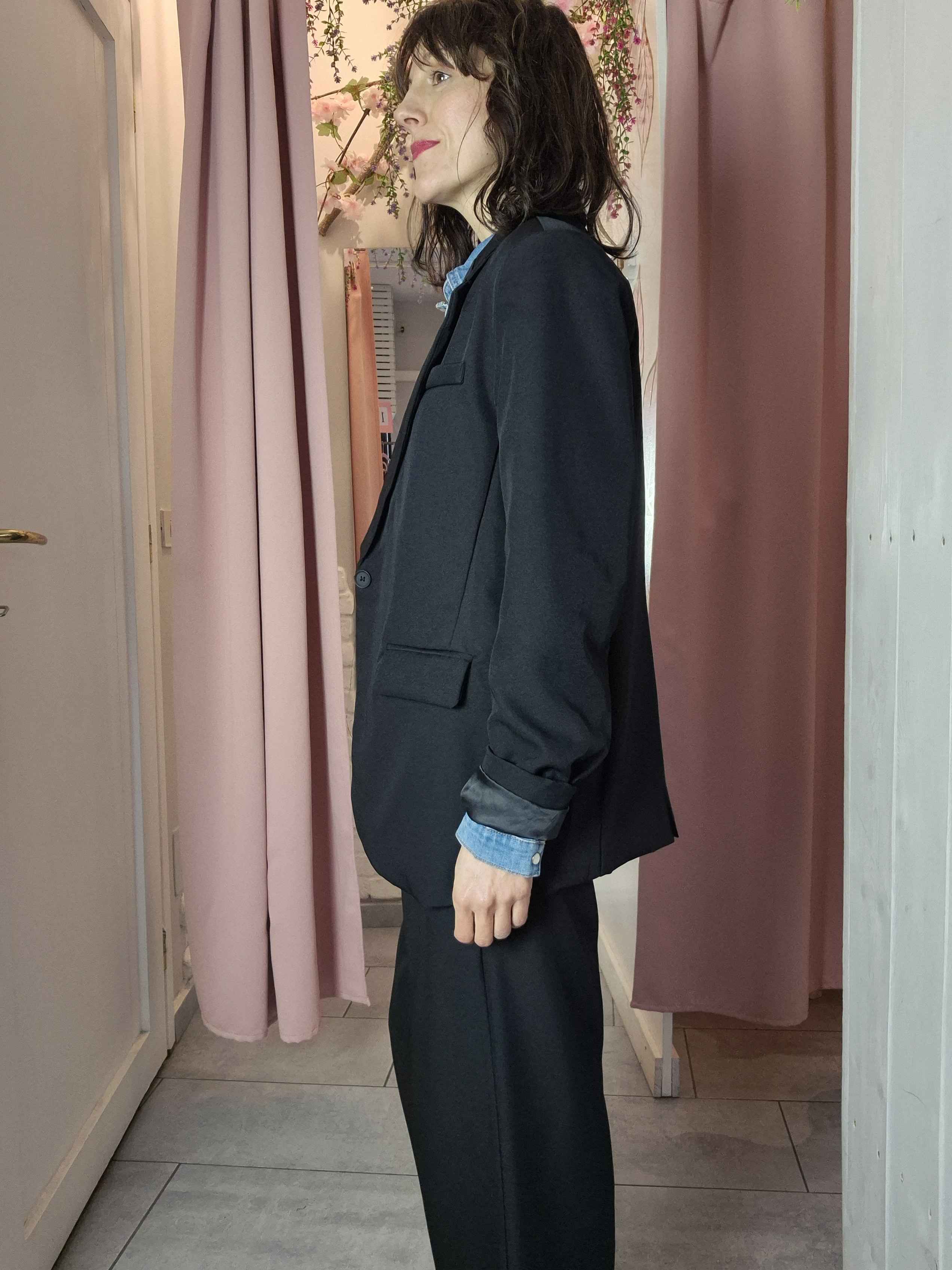 Il pantalone wide a gamba larga bilancia la figura con una linea fluida e slanciata, mentre il bottone davanti e l’elastico sul retro garantiscono comfort e vestibilità anche dopo molte ore. Un completo che veste bene, non segna e si adatta con naturalezza al corpo.