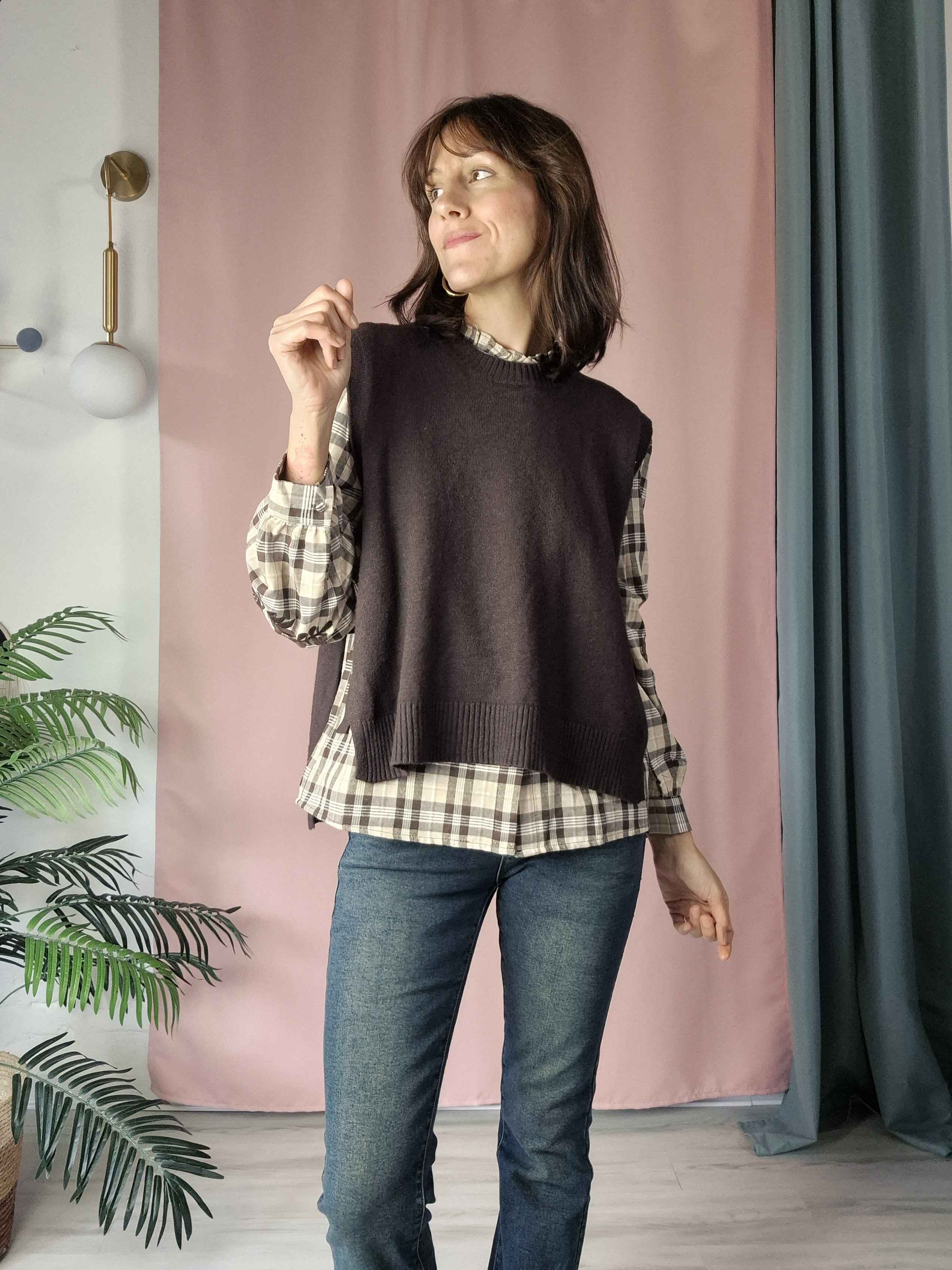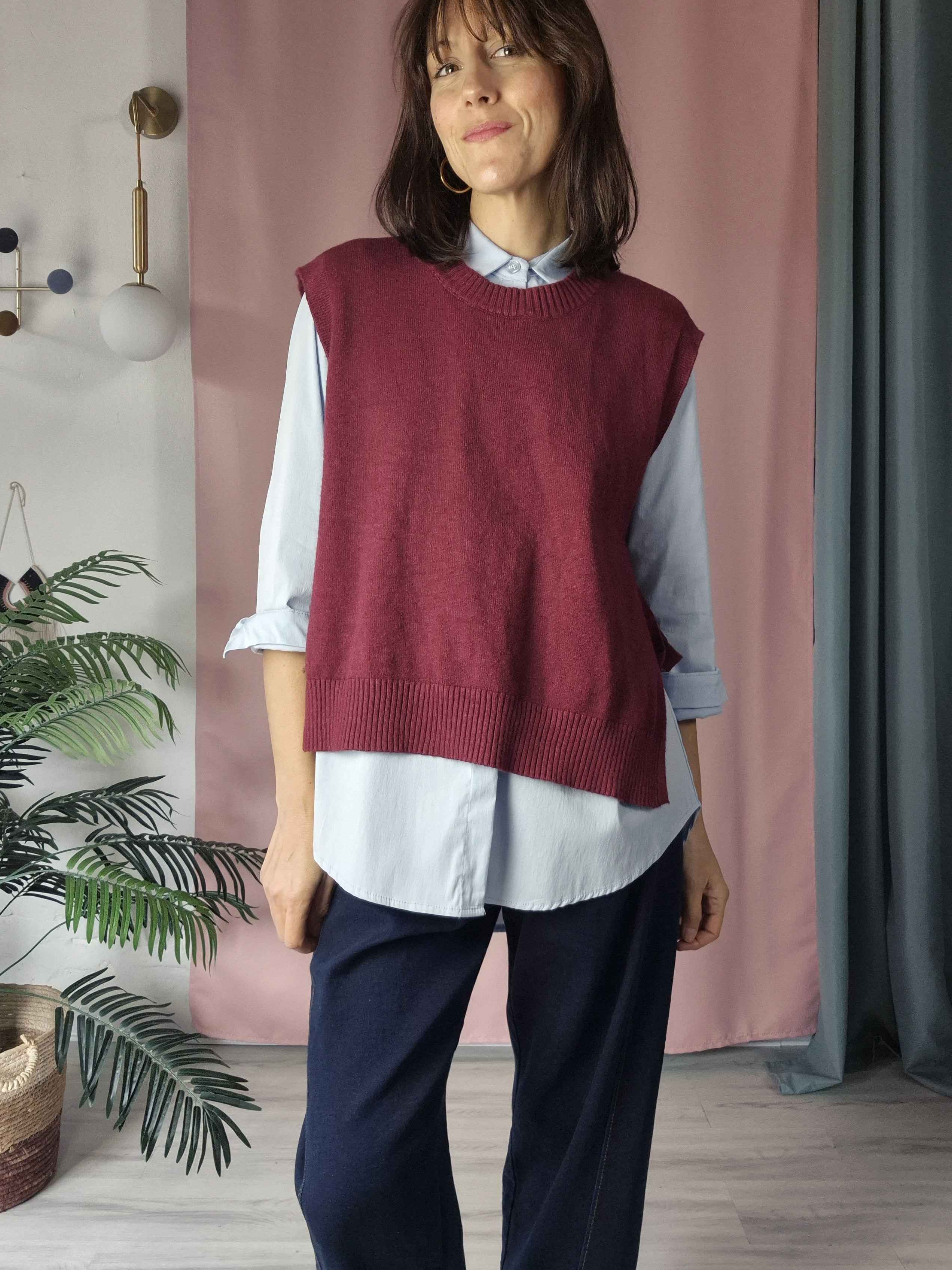 La vestibilità è regolabile grazie ai due lacetti laterali, che permettono di adattarlo al corpo in modo confortevole. Il filato compatto e caldo lo rende un alleato ideale quando le temperature si abbassano, senza rinunciare allo stile.