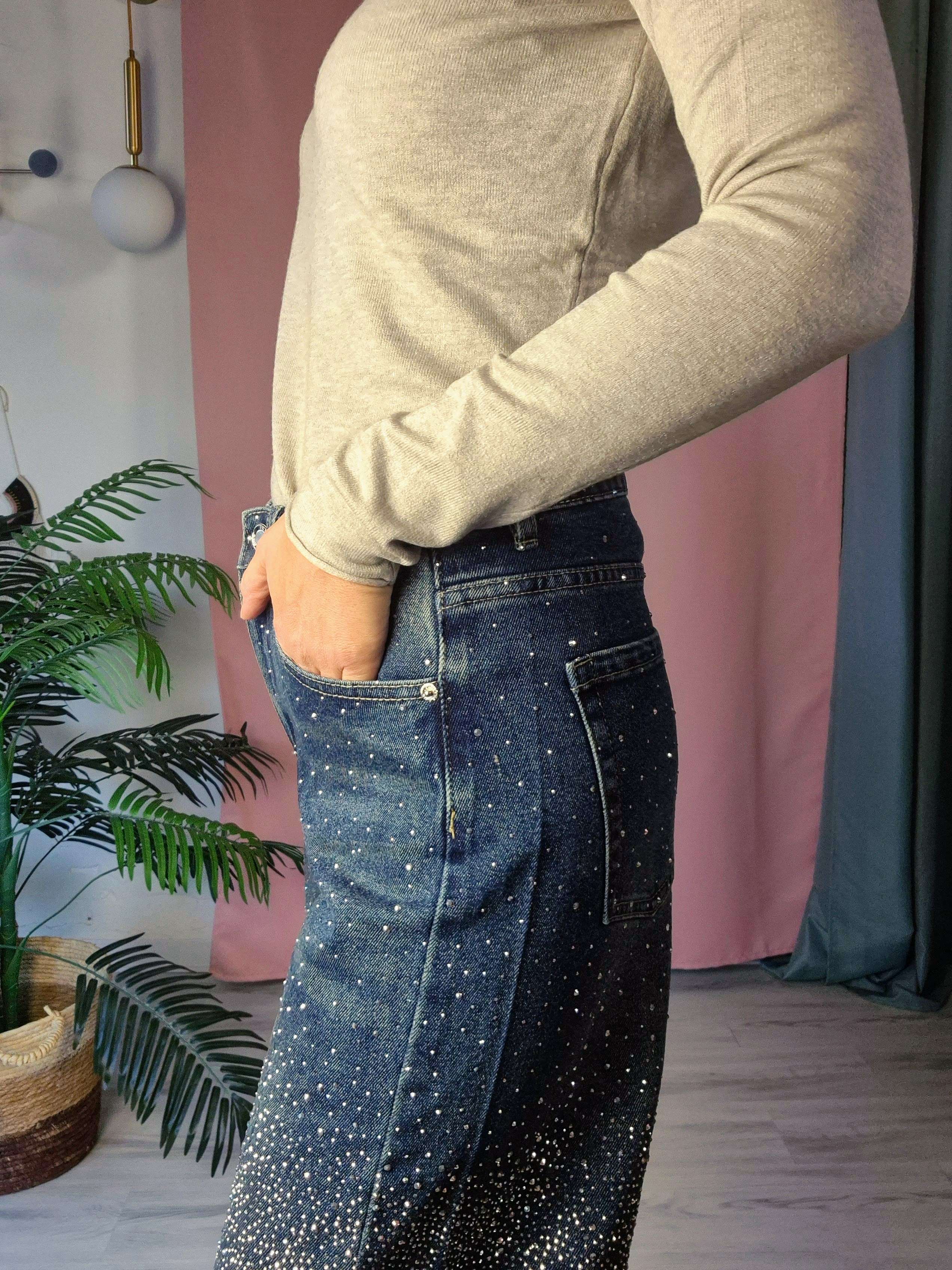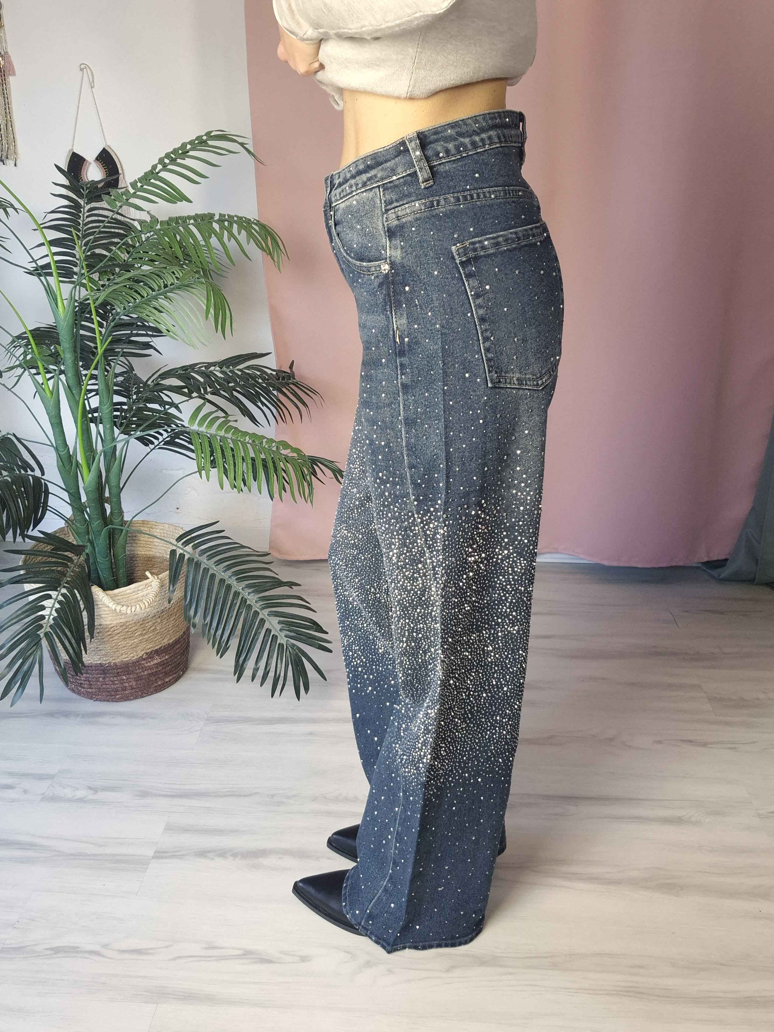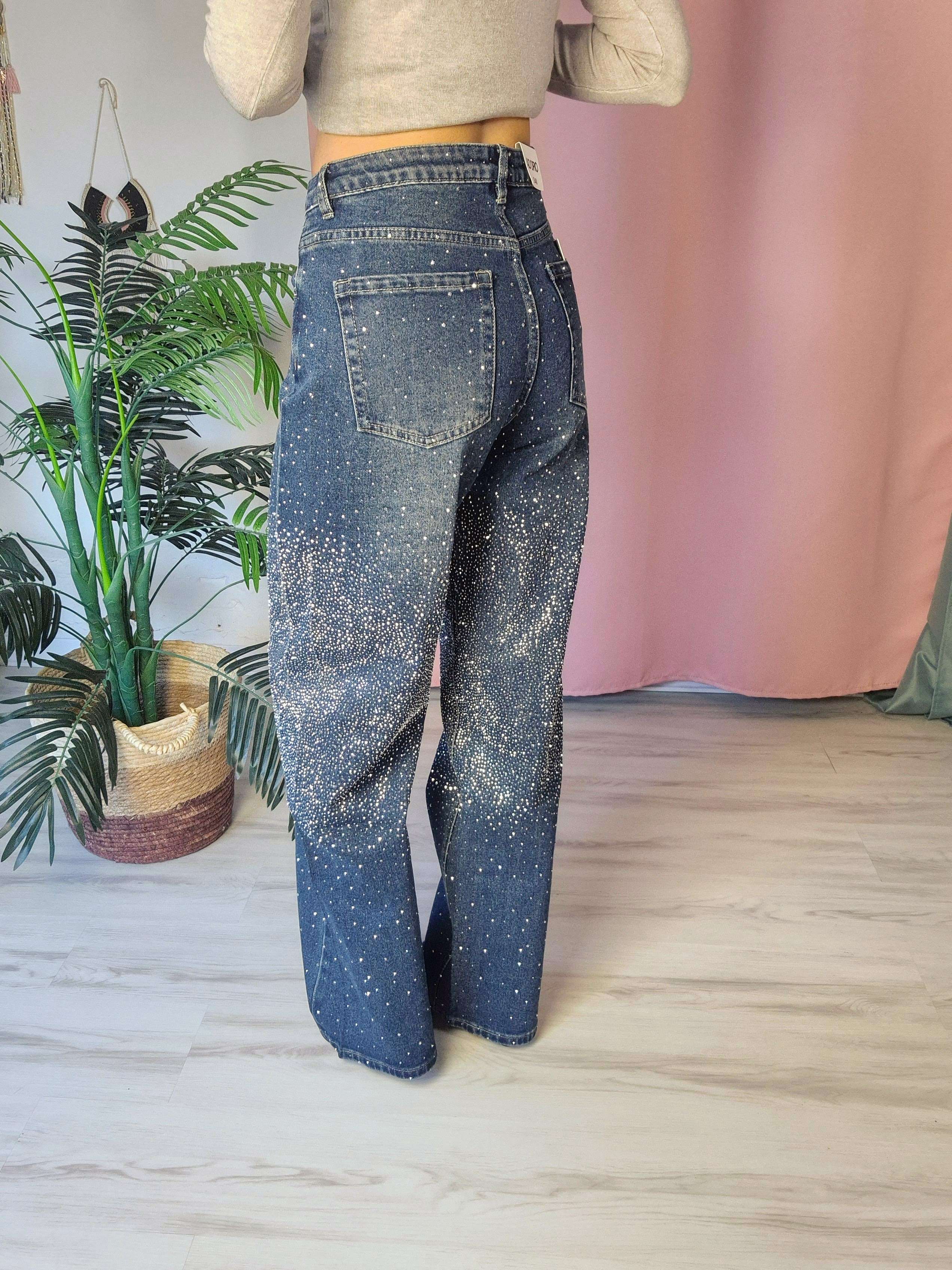 Dettagli: micro borchie applicate su tutta la gamba, modello cinque tasche, vita regolare