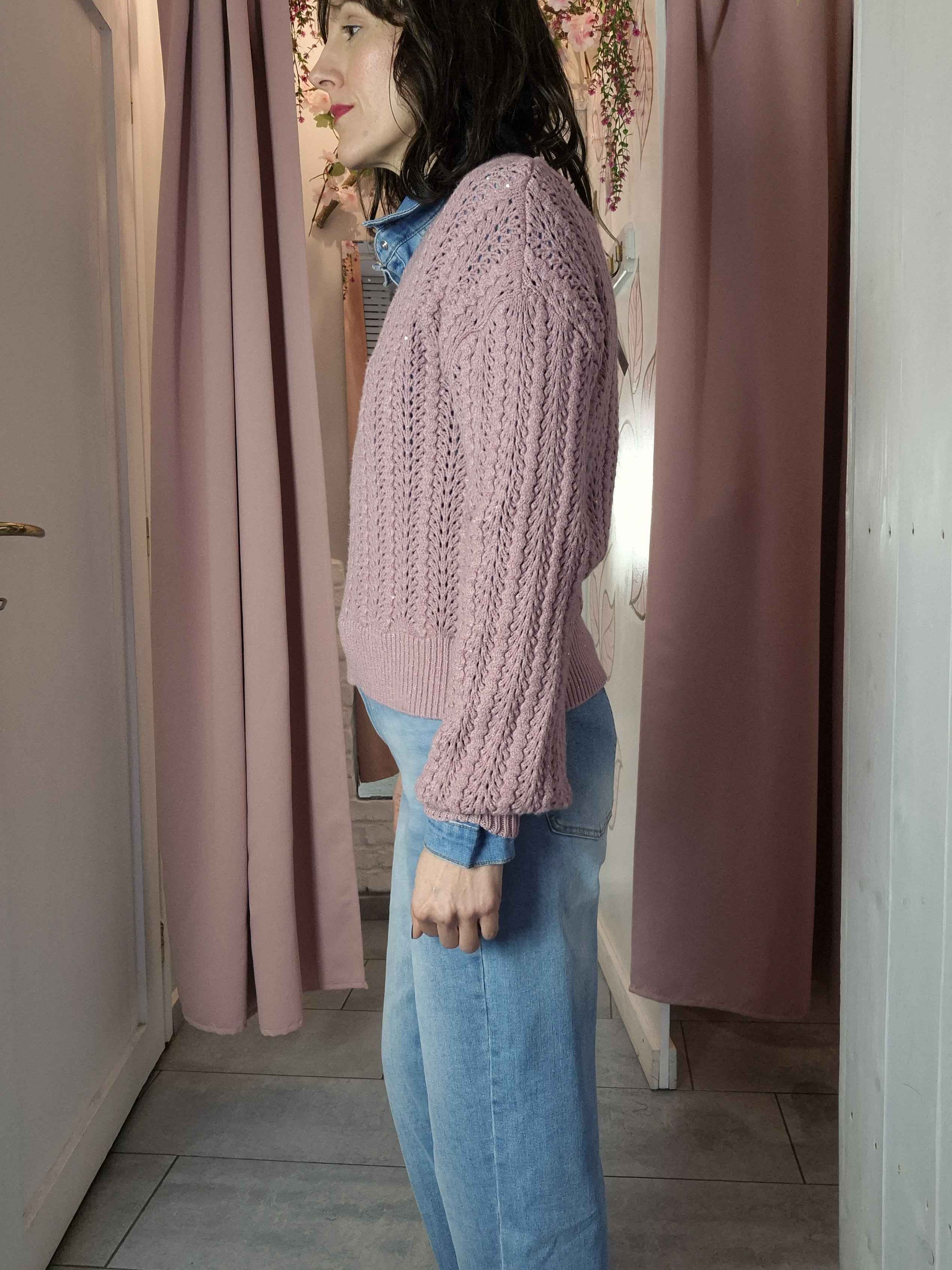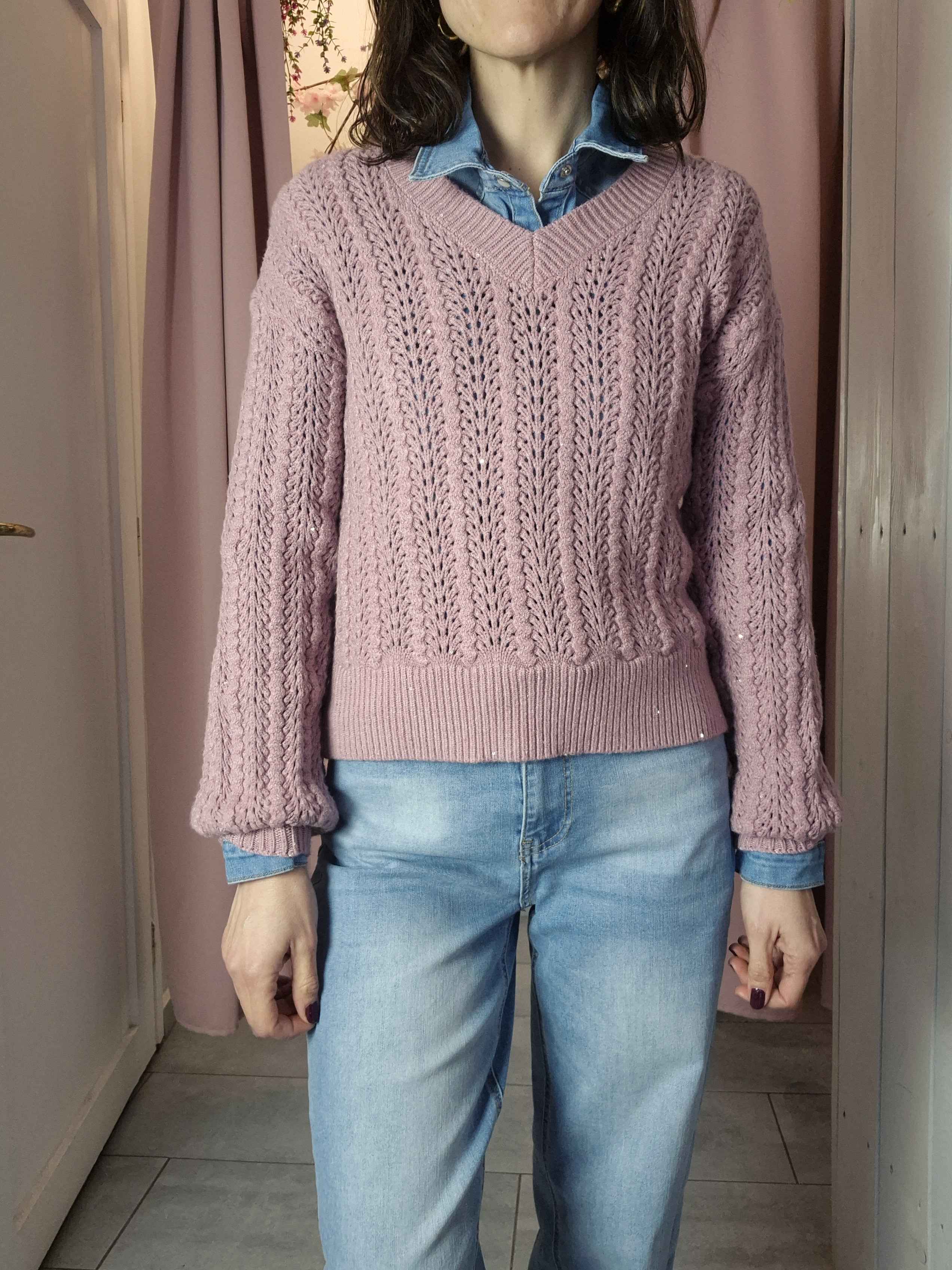 Lo scollo a V valorizza il décolleté con eleganza, mentre la lavorazione traforata rende il capo leggero e raffinato. Le micro paillettes applicate catturano la luce con delicatezza, regalando un effetto brillante mai eccessivo.