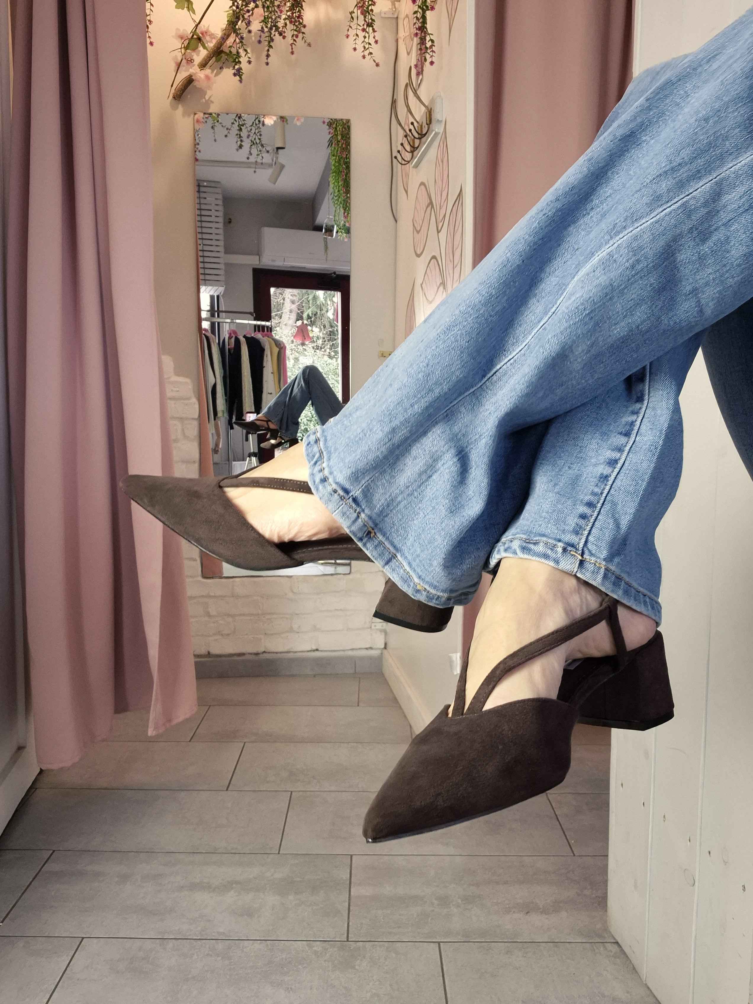 La punta affusolata slancia la figura con delicatezza, mentre i cinturini sottili che avvolgono il piede creano un gioco raffinato e moderno. Il suede marrone caldo rende il modello versatile e perfetto per la stagione.