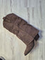 Realizzato in tessuto effetto suede color marrone, avvolge la gamba con un gambale morbido e leggermente arricciato, regalando uno stile naturale e disinvolto.
