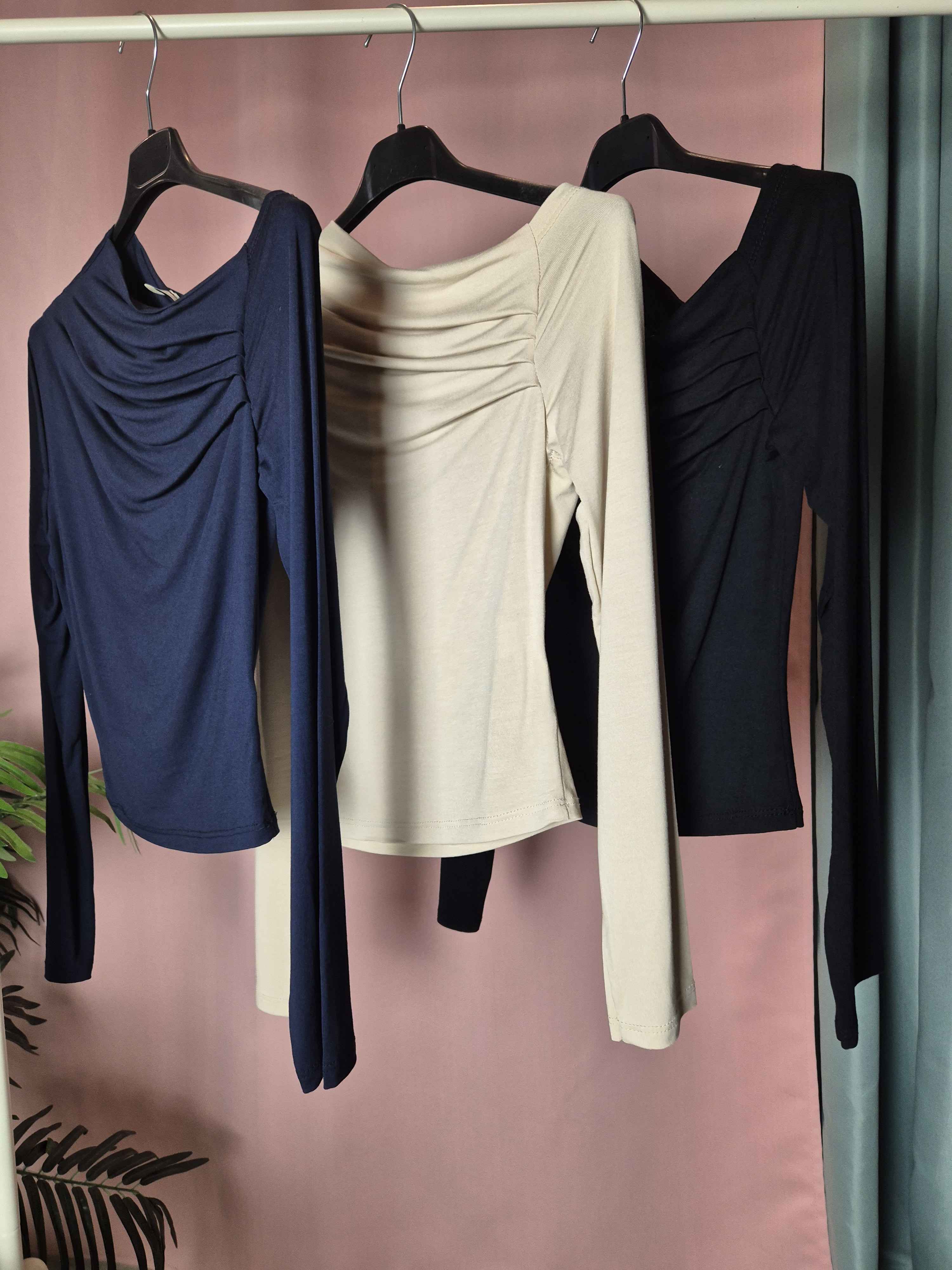 • Caratteristiche: collo a barchetta asimmetrico, ricciatura frontale, maniche lunghe, vestibilità aderente
