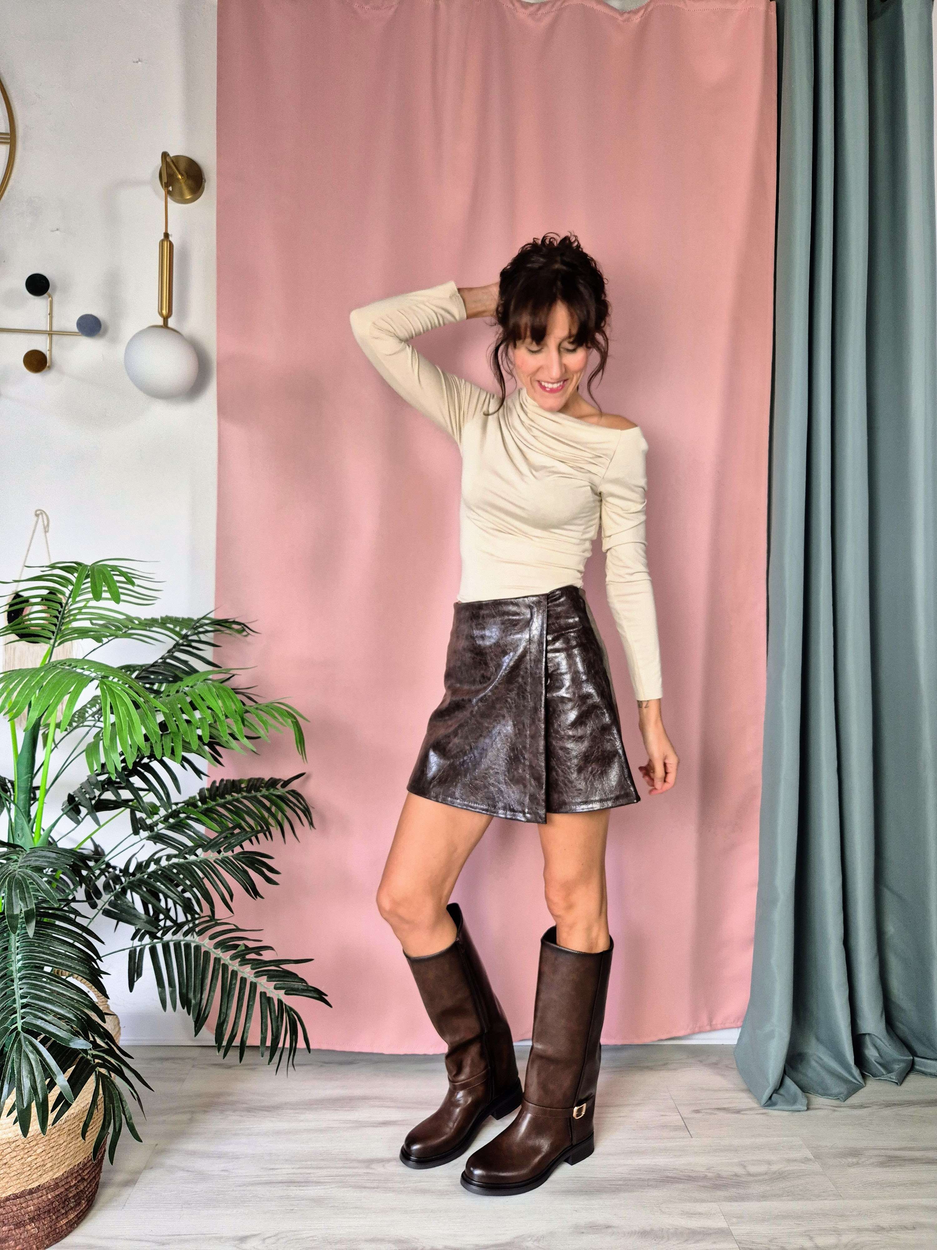 • Con gonna in pelle e stivaletti per il look urban-trendy.