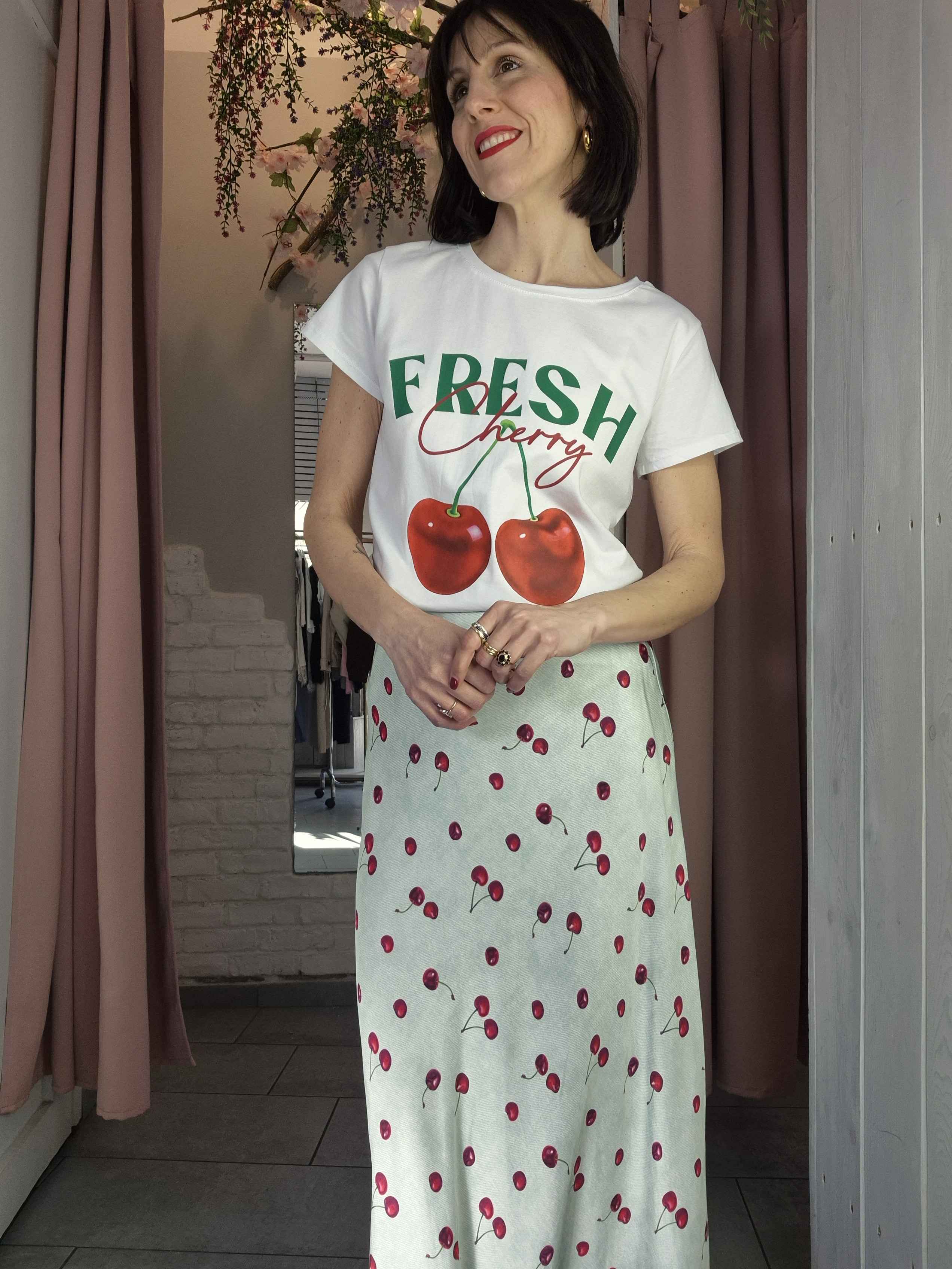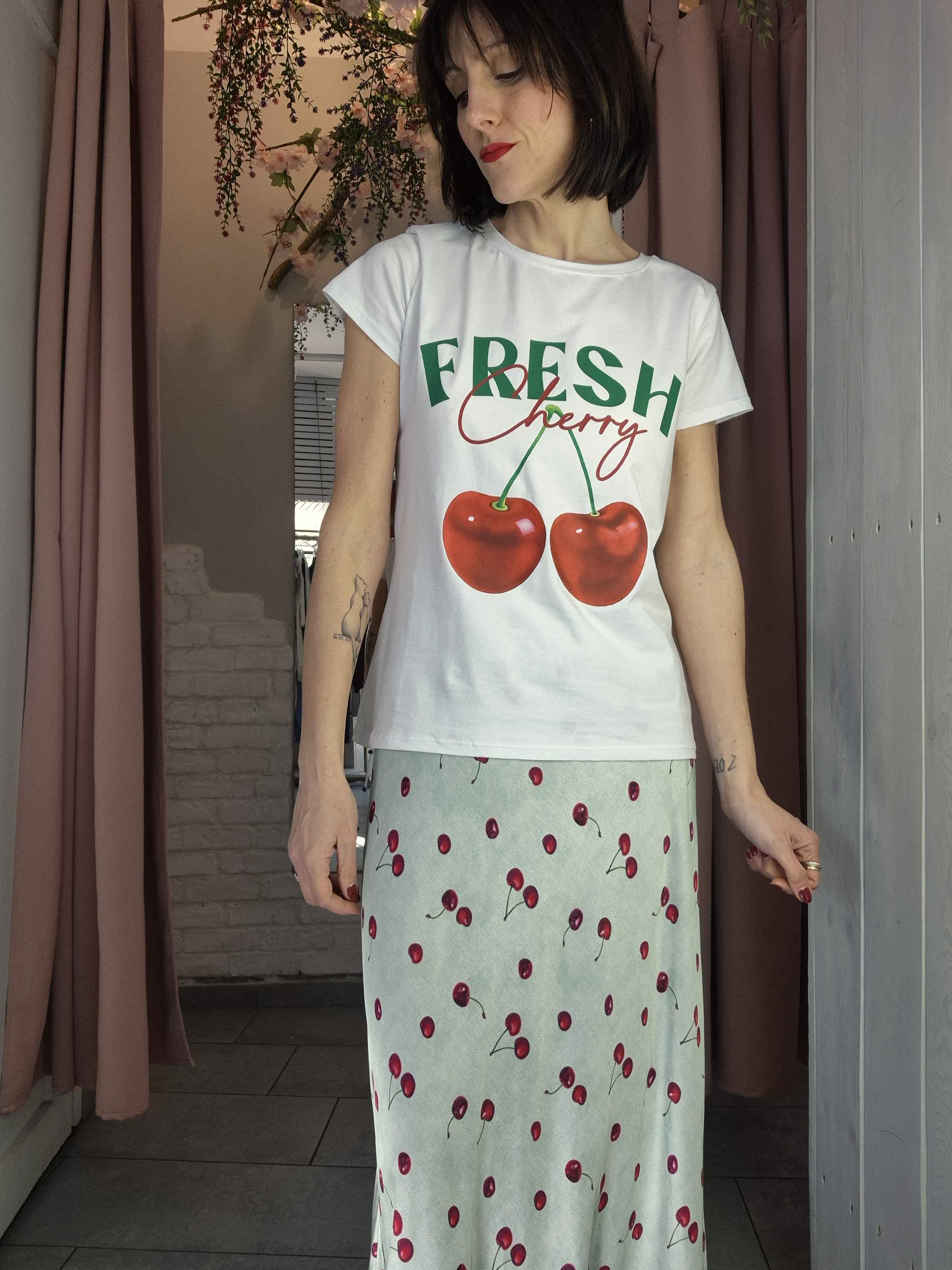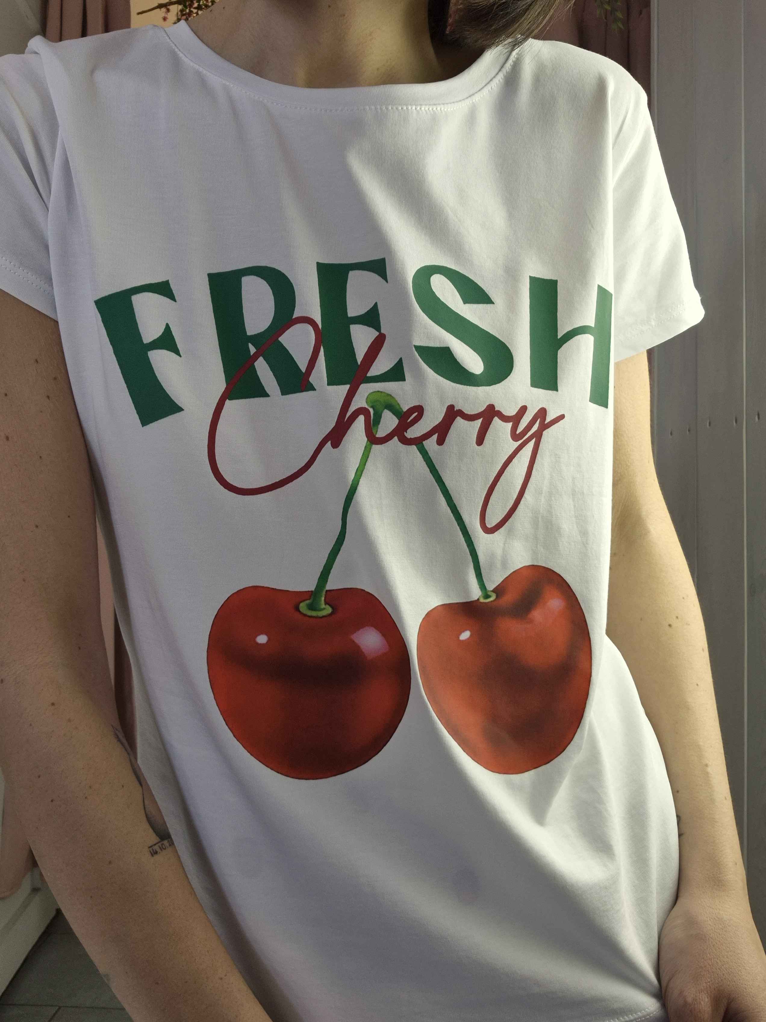 La T-shirt Fresh Cherry è il capo perfetto per dare un tocco vivace e originale ai tuoi look quotidiani. La stampa con le ciliegie e la scritta Fresh Cherry dona al capo uno stile fresco, colorato e molto di tendenza.